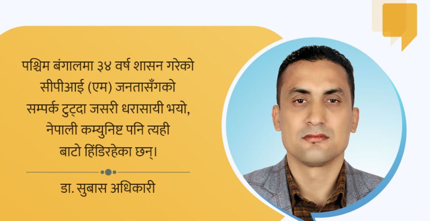 - पश्चिम बंगाल में ३४ वर्षों तक शासन करने वाली CPI (एम) जनता से संपर्क टूटने पर ध्वस्त हुई, वैसे ही नेपाली कम्युनिस्ट पार्टियाँ भी उसी मार्ग पर चल रही हैं।