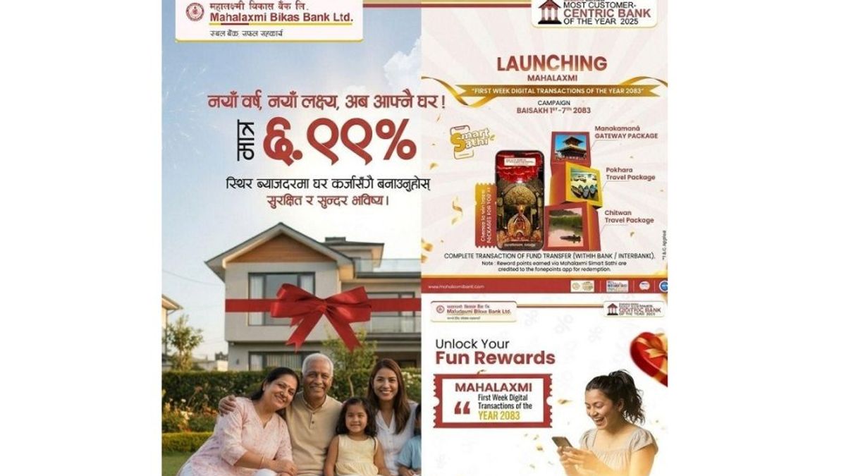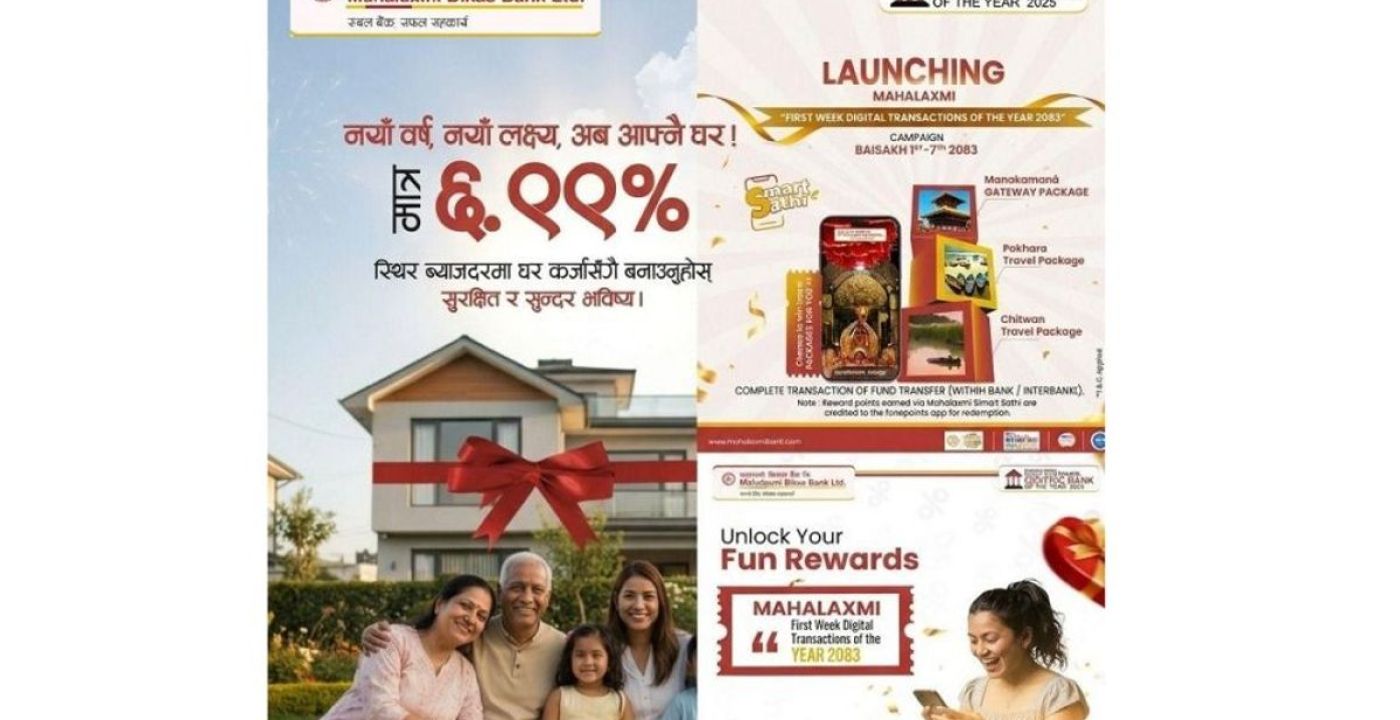 ग्राहकों को आधुनिक, सुरक्षित और सहज बैंकिंग सेवा प्रदान करने वाले महालक्ष्मी विकास बैंक ने नए वर्ष २०७८ को ध्यान में रखते हुए कई योजनाएँ सार्वजनिक की हैं। बैंक की योजना के अनुसार, जो नया वर्ष डिजिटल प्रचार वर्ष माना जाएगा, मोबाइल ऐप ‘महालक्ष्मी स्मार्ट साथी’ के जरिए बैंक के सभी सक्रिय मोबाइल बैंकिंग उपयोगकर्ताओं को वैशाख महीने के पहले सप्ताह में कम से कम एक सफल लेन-देन करना होगा। इस प्रक्रिया के तहत आयोजित गोलाप्रथा में तीन उपयोगकर्ता आकर्षक भ्रमण पैकेज जीत सकेंगे।