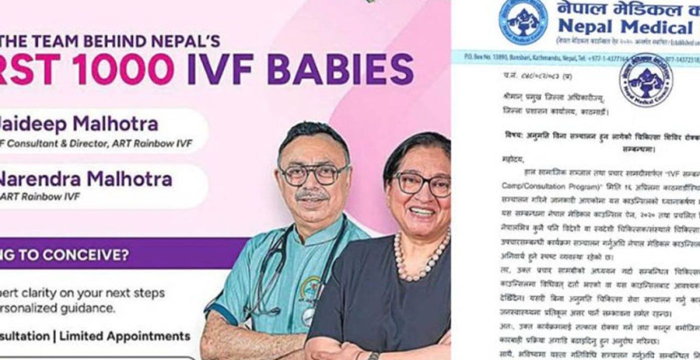 नेपाल मेडिकल काउंसिल ने बिना अनुमति चलाए जाने वाले आईवीएफ शिविर को रोकने प्रशासन को लिखा पत्र