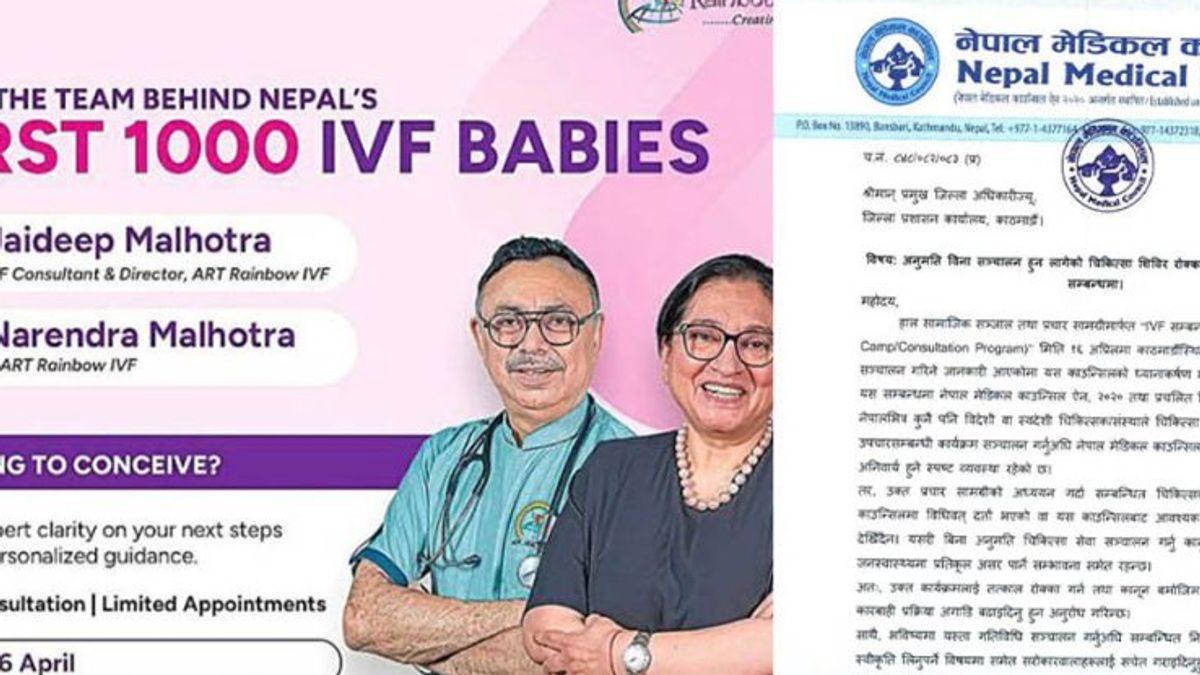 नेपाल मेडिकल काउंसिल ने बिना अनुमति संचालित होने वाले आईवीएफ से संबंधित चिकित्सा शिविर को रोकने के लिए प्रशासन को पत्र लिखा है। काउंसिल ने चिकित्सा सेवा संचालित करने के लिए पंजीकरण और पूर्व-स्वीकृति आवश्यक होने के बावजूद बिना अनुमति कार्य करना कानून के विरुद्ध और जनस्वास्थ्य के लिए नकारात्मक बताकर चेतावनी दी है। पत्र के माध्यम से प्रशासन से इस कार्यक्रम को तत्काल बंद करने, जांच करने और कानूनी कार्रवाई करने का अनुरोध किया गया है। २ वैशाख, काठमांडू।