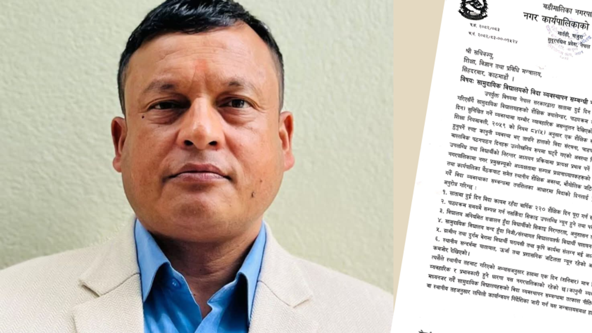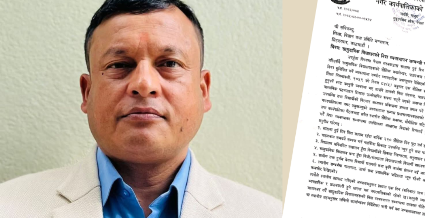पत्र में शिक्षा नियमावली, 2059 की नियम 84 (5) के अनुसार एक शैक्षणिक सत्र में कम से कम 220 दिन विद्यालय संचालन अनिवार्य है, फिर भी वर्तमान छुट्टी संरचना से इस व्यवस्था के कार्यान्वयन में व्यावहारिक समस्याएं उत्पन्न हो रही हैं। नगर प्रमुख खड़का ने बताया कि इसी आधार पर नगरपालिका ने स्थानीय तह पर अपनाए गए मॉडल के अनुसार सप्ताह में केवल एक दिन अर्थात शनिवार को छुट्टी देने का प्रावधान शैक्षिक दृष्टि से अधिक उपयुक्त और प्रभावशाली पाया है।