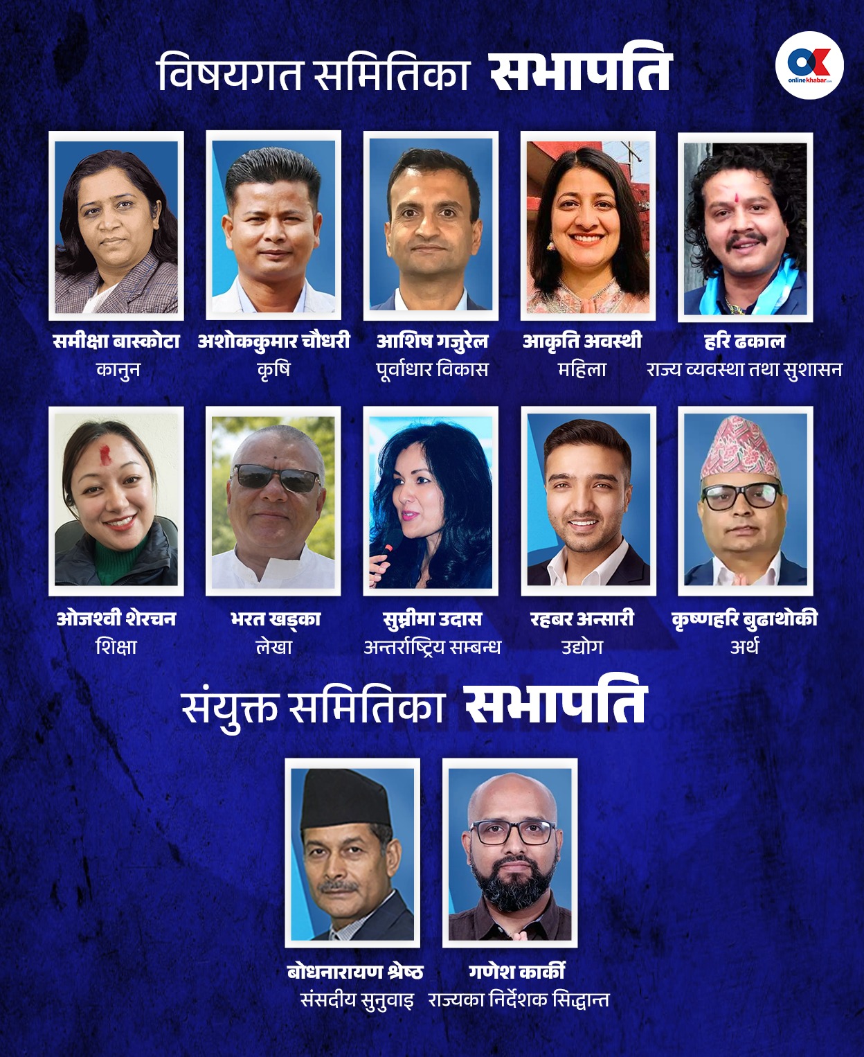 राज्य के निर्देशक सिद्धांत, नीति और दायित्व कार्यान्वयन अनुश्रवण एवं मूल्यांकन समिति के सभापति गणेश कार्की, शिक्षा, स्वास्थ्य तथा सूचना प्रौद्योगिकी समिति के सभापति ओजस्वी शेरचन और उद्योग, वाणिज्य तथा श्रम एवं उपभोक्ता हित समिति के सभापति रहबर अंसारी हैं।