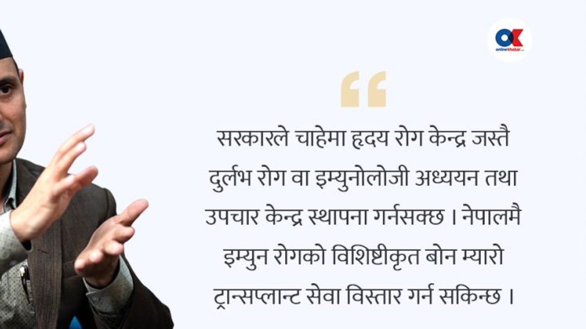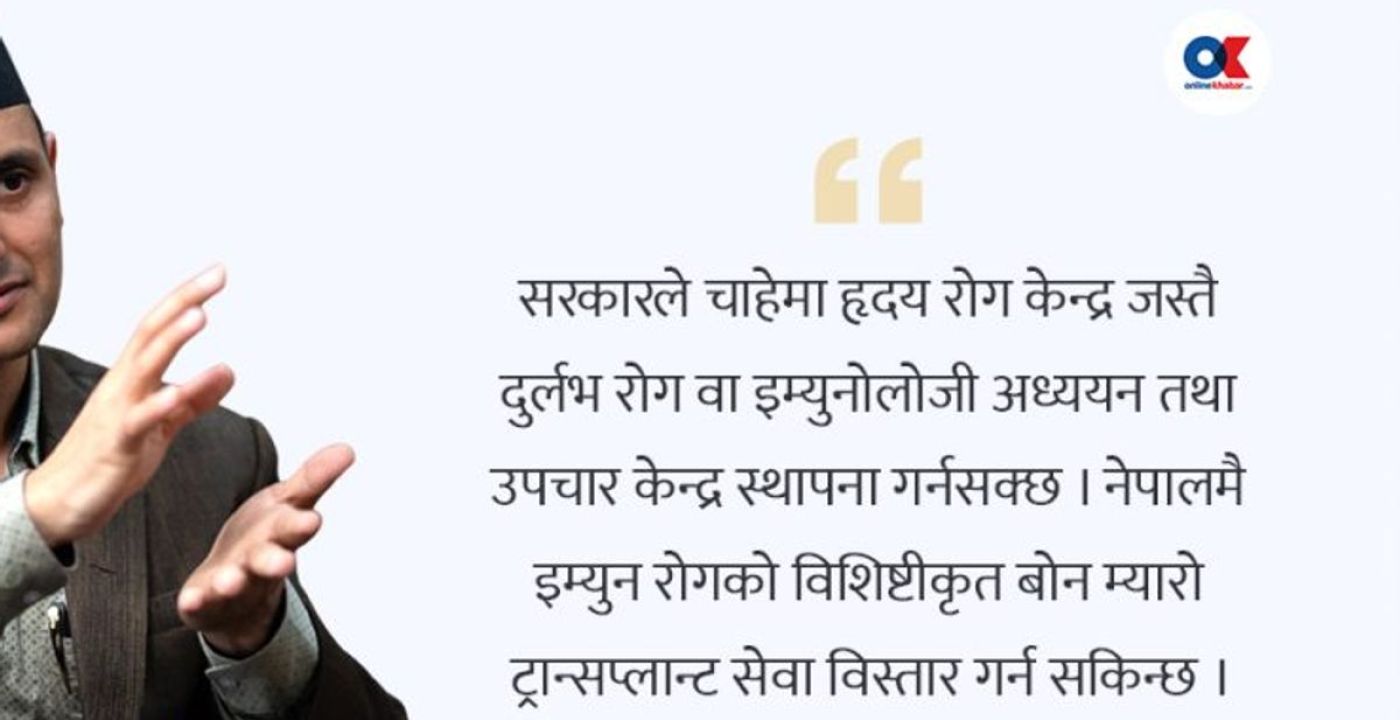 सरकारले इम्युनोलोजी सेवा विस्तारका लागि के कदम चाल्नुपर्छ? सरकारले हृदय रोग केन्द्रको रूपमा दुर्लभ रोग र इम्युनोलोजीका लागि अध्ययन र उपचार केन्द्र स्थापना गर्नुपर्छ। नेपालमै बोन म्यारो ट्रान्सप्लान्ट सेवा विस्तार गर्न सकिन्छ। तर एउटाले मात्र सम्भव छैन, मेडिकल शिक्षण संस्थाले इम्युनोलोजी संकाय स्थापना गरी यसको शिक्षण सुरु गर्नुपर्नेछ।