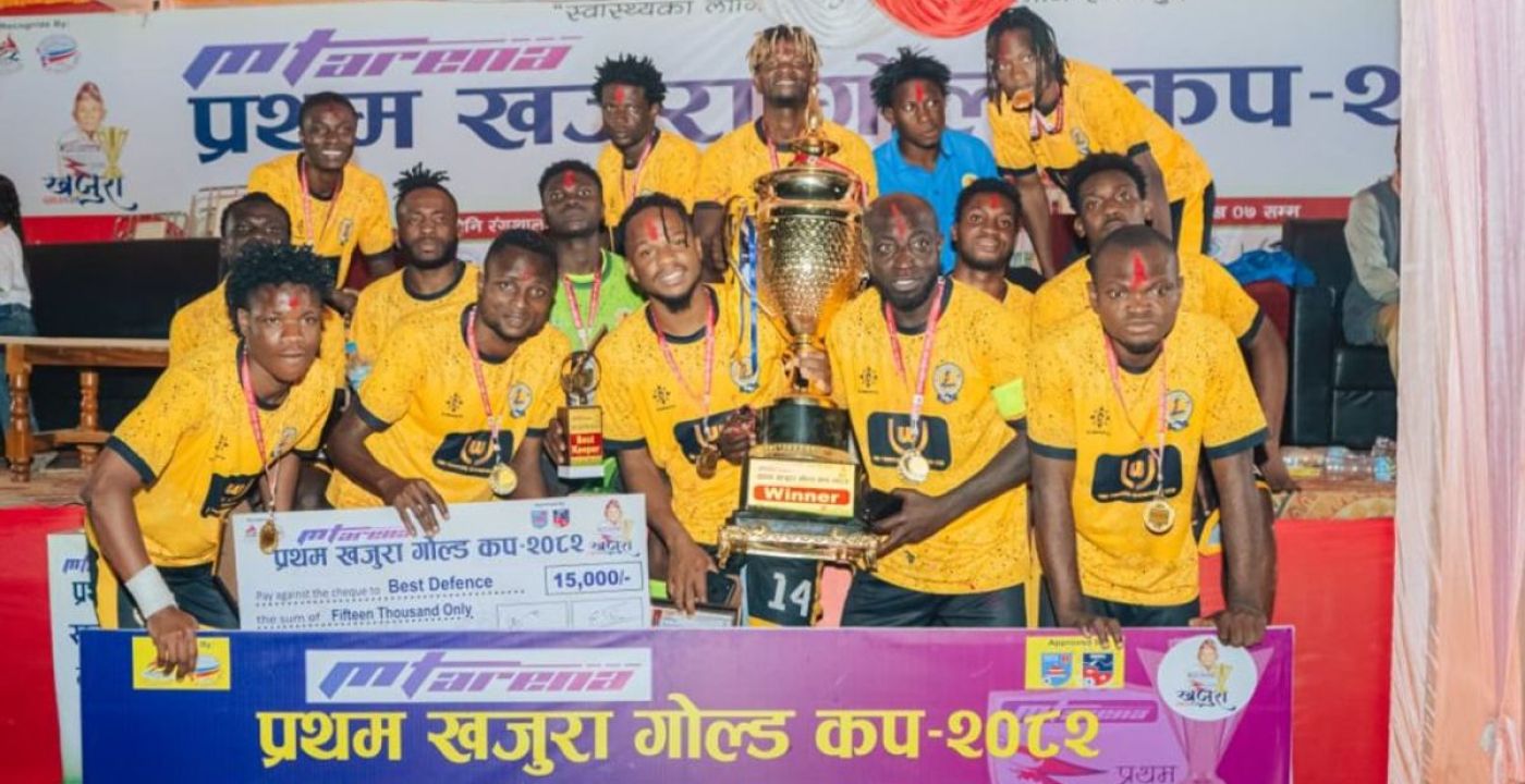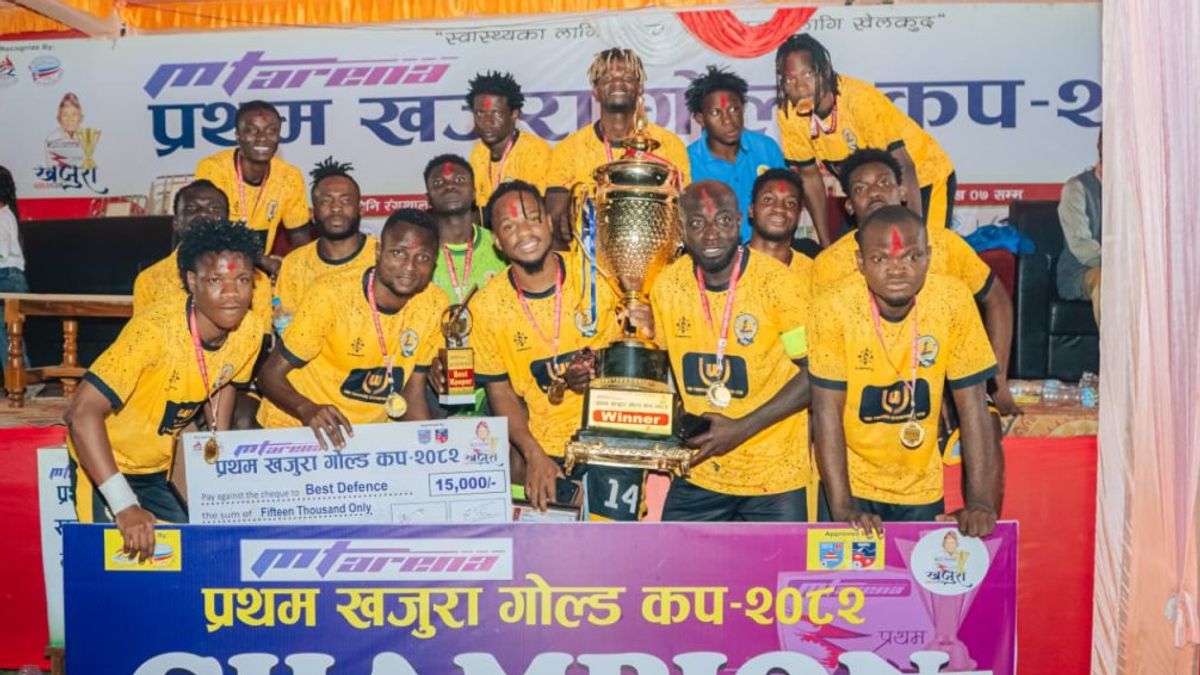 ६ वैशाख, नेपालगंज। खजुरा गाउँपालिका-४, डी गांव की मिनी स्टेडियम में रविवार को आयोजित फाइनल मैच में नाइजेरियाई टीम जस्ट जोन ने भारत के जेवीएम क्लब लखनऊ को ४-० गोल अंतर से मात देकर चैंपियनशپ जीत ली। नाइजेरियाई जीत में क्लब कोन ने दो गोल किए, जबकि एडवर्ड थोमस और ओलावी अफीज ने एक-एक गोल दागा। उपाधि के साथ नाइजेरियाई जस्ट जोन को चार लाख नकद, ट्रॉफी, मेडल और प्रमाणपत्र दिए गए, वहीं उपविजेता जेवीएम को भी चार लाख नकद और पुरस्कार मिला।