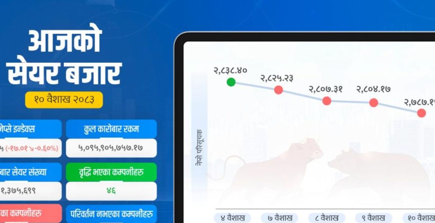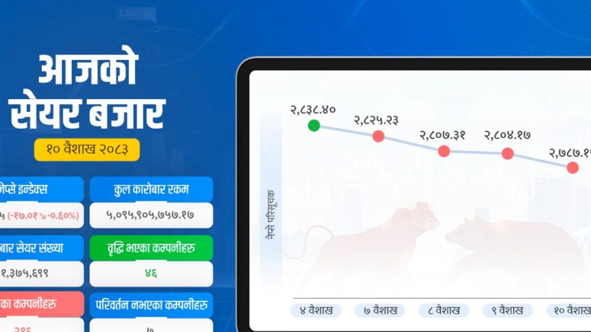नेप्से सूचकांक 10 वैशाख को 17.01 अंकों की गिरावट के साथ 2787 अंकों पर पहुंच गया है। बाजार में 46 कंपनियों के शेयर मूल्यों में वृद्धि हुई जबकि 216 कंपनियों के शेयर मूल्य कम हुए हैं। सूर्यकुंड हाइड्रो इलेक्ट्रिक का मूल्य सबसे अधिक 11.79 प्रतिशत घटा है। 10 वैशाख, काठमांडू। गुरुवार को भी शेयर बाजार में गिरावट का सिलसिला जारी रहा। इस दिन नेप्से सूचकांक पिछले दिन की तुलना में 17.01 अंक गिर गया। पिछले चार कारोबारी दिनों से बाजार लगातार नीचे आ रहा है। पिछले दिन 2804 अंक था, जो आज 2787 अंक हो गया है। कारोबार राशि भी महत्वपूर्ण रूप से घट गई है। पिछले दिन 7 अरब 81 करोड़ रुपये का कारोबार हुआ था, जबकि आज मात्र 5 अरब 9 करोड़ रुपये का कारोबार हुआ।