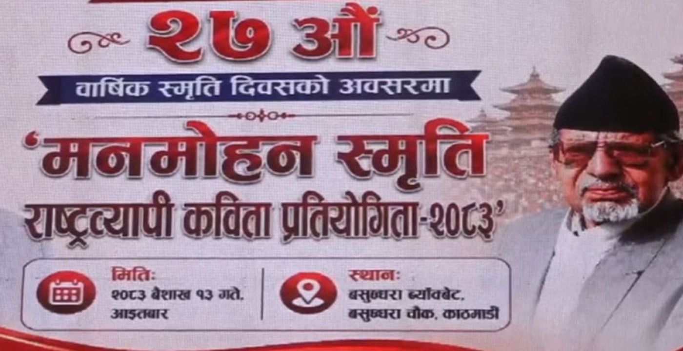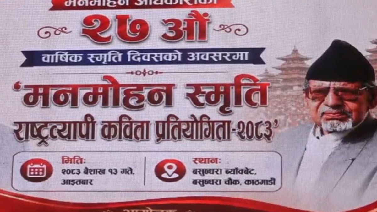 १३ वैशाख, काठमाडौं। मनमोहन अधिकारी के स्मृति दिवस के अवसर पर मनमोहन स्मृति प्रतिष्ठान ने रविवार को ललितपुर के सानेपास्थित उनके शालिक पर माल्यार्पण सहित सभा आयोजित की। इसी प्रकार, प्रतिष्ठान ने काठमाडौं में मनमोहन स्मृति राष्ट्रव्यापी कविता प्रतियोगिता कार्यक्रम का भी आयोजन किया।