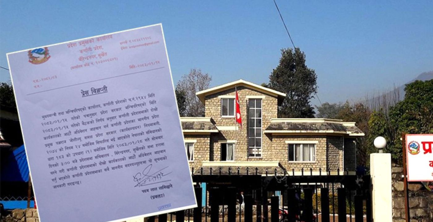 १२ वैशाख, सुर्खेत । कर्णाली प्रदेश सभा का आठवां अधिवेशन वैशाख २८ से शुरू होने जा रहा है। मंगलवार को हुई मन्त्रिपरिषद की बैठक में प्रदेश प्रमुख यज्ञराज जोशी को वैशाख २८ से संसद अधिवेशन बुलाने की सिफारिश की गई थी। सरकार की सिफारिश के आधार पर प्रदेश प्रमुख जोशी ने घोषणा की है कि वे वैशाख २८, सोमवार को दोपहर ३ बजे बैठक आह्वान करेंगे।