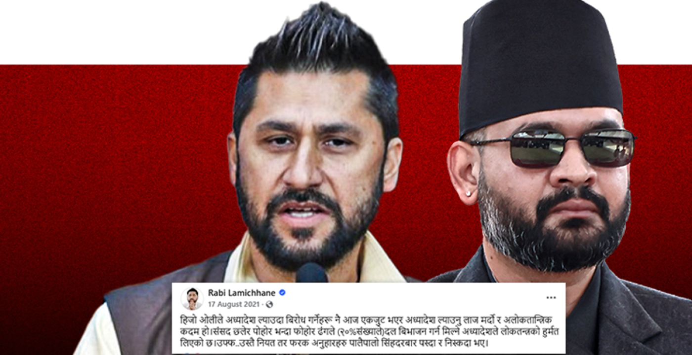 १५ वैशाख, काठमाडौं। १ भदौ २०७८ को दिन तत्कालीन शेरबहादुर देउवा सरकार ने २० प्रतिशत सांसद या केन्द्रीय समिति के सदस्यों की संख्या से दल विभाजन की अनुमति देने वाला अध्यादेश जारी किया था। उस समय रवि लामिछाने ने इस अध्यादेश का विरोध करते हुए सोशल मीडिया में अपनी आपत्ति जताई थी।