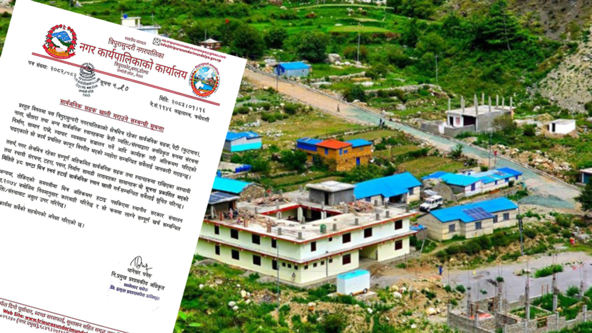 डोल्पा की त्रिपुरासुन्दरी नगरपालिका ने सार्वजनिक सड़कों और स्थानों पर किए गए अवैध अतिक्रमण को हटाने के लिए 48 घंटे की अंतिम सूचना जारी की है। नगरपालिका ने बिना अनुमति बनाए गए संरचना, सामग्री भण्डारण और व्यापार संचालित करने को तुरंत बंद करने का आदेश दिया है। यदि अतिक्रमण नहीं हटाया गया तो स्थानीय सरकार संचालन अधिनियम, 2074 के अनुसार कार्रवाई की जाएगी और इसका खर्च अतिक्रमण करने वाले व्यक्ति या संस्था से वसूल किया जाएगा, यह जानकारी नगरपालिका ने साझा की है।