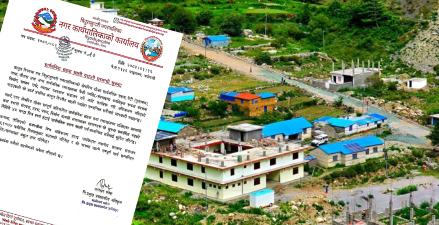 16 वैशाख, डोल्पा। हिमालयी जिले डोल्पा की त्रिपुरासुन्दरी नगरपालिका ने सार्वजनिक सड़कों और अन्य सार्वजनिक स्थानों पर अतिक्रमण हटाने के लिए 48 घंटे की अंतिम सूचना जारी की है। नगरपालिका ने बुधवार को एक सूचना के माध्यम से बताया कि नगर क्षेत्र के सड़कों, फुटपाथ, नालों, चौतारों आदि स्थानों पर बिना अनुमति संरचना निर्माण, सामग्री भण्डारण और व्यावसायिक गतिविधियाँ बढ़ रही हैं, जो कानूनी दृष्टि से अवैध हैं, इसलिए इन्हें तुरंत हटाने का निर्देश दिया गया है, यह जानकारी नगरपालिका के निमित्त प्रमुख प्रशासनिक अधिकारी थानेश्वर पनेरुले दी।